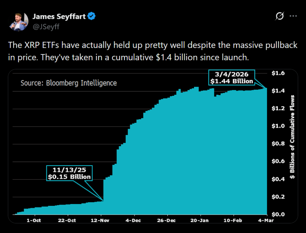 Data shared by Bloomberg Intelligence analyst James Seyffart shows that XRP ETFs collectively accumulated more than $1.4 billion in net inflows since their debut. The funds launched into one of the toughest crypto market environments in recent years.