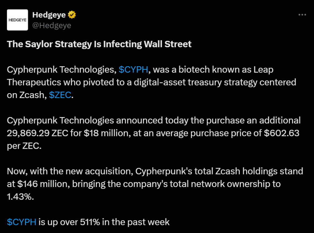 - ZEC is up 140% in a month, with Cypherpunk sitting on 120% paper gains.