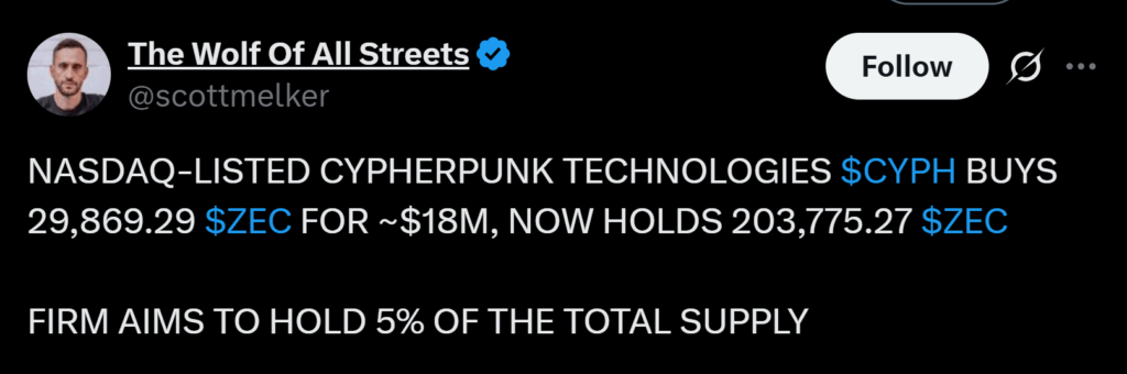 - Cypherpunk Technologies added $18M in Zcash, bringing its total holdings to 233,644 ZEC.