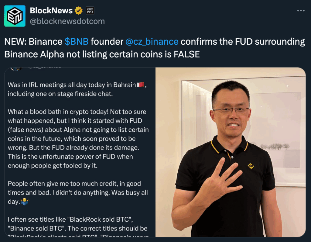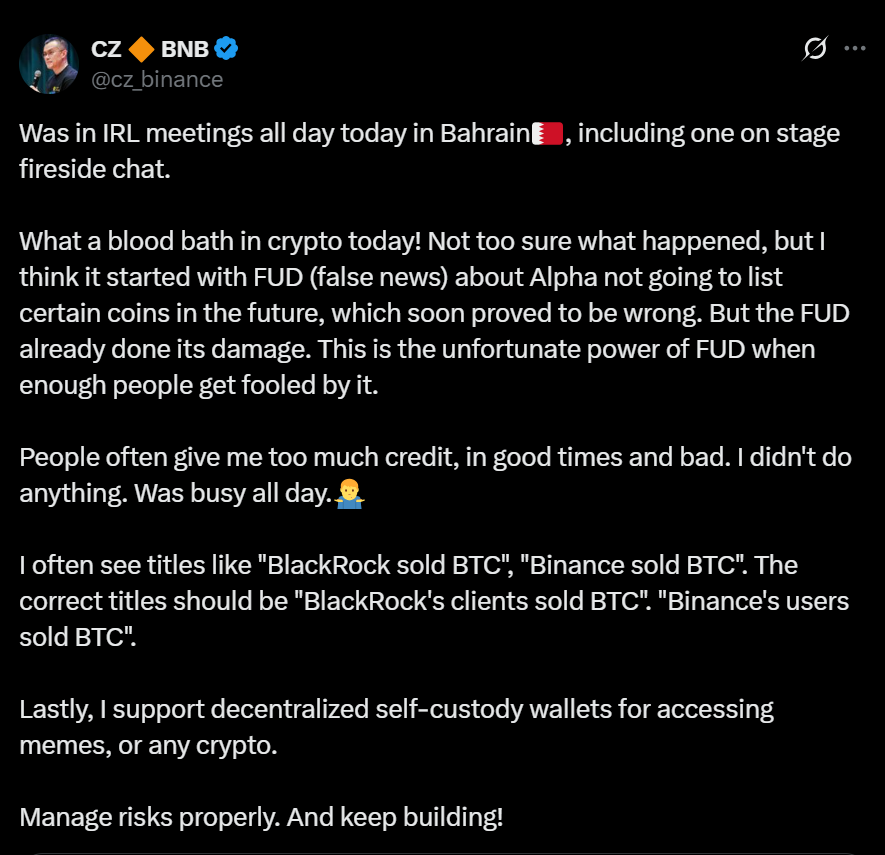 Binance founder Changpeng “CZ” Zhao, currently in Bahrain for meetings and a fireside chat, responded via X, saying he had no involvement in the day’s events. He attributed the selloff to false reports and highlighted the “unfortunate power of FUD” once enough traders believe it. CZ also criticized misleading headlines such as “Binance sold BTC,” arguing that it’s usually “Binance users” making trades—not the company itself.