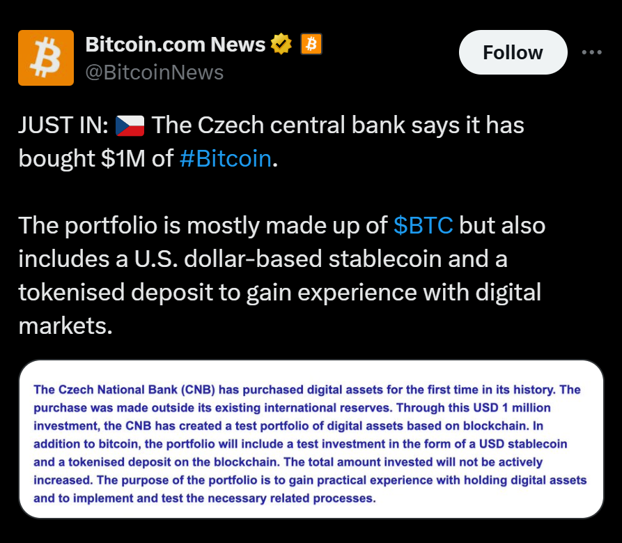 The Czech National Bank (CNB) has officially become the first central bank in the world to hold Bitcoin on its balance sheet, marking a watershed moment for institutional crypto adoption. The bank confirmed it created a $1 million “test portfolio” made up primarily of Bitcoin, along with a USD stablecoin and a tokenized deposit. The goal is to gain practical experience with blockchain-based assets and understand how decentralized systems might integrate with future financial infrastructure.