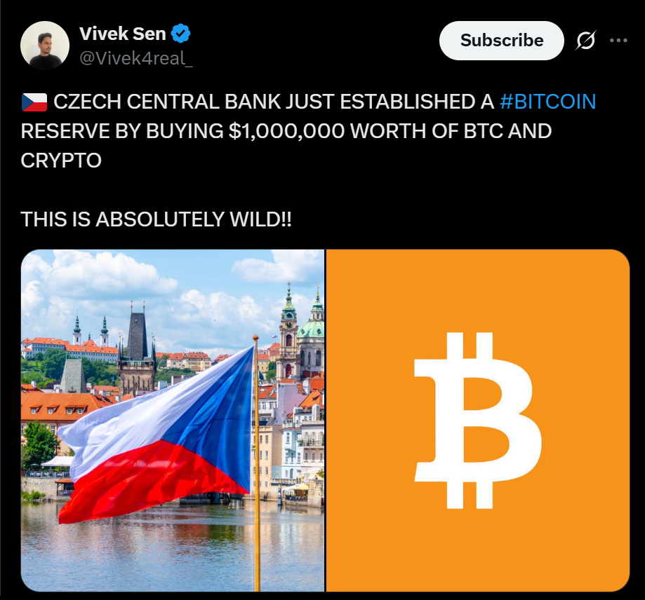 - The Czech National Bank created a $1 million test portfolio that includes Bitcoin, a USD stablecoin, and a tokenized deposit.