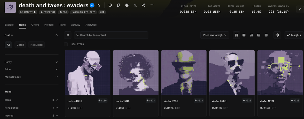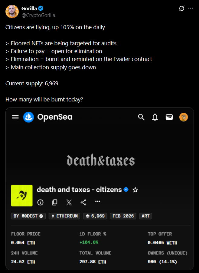 The NFT project Death and Taxes turns an old saying into a ruthless on-chain game where survival literally depends on paying up. At launch, 6,969 NFTs known as Citizens entered the system with a mint price of 0.0169 ETH each. But simply holding the NFT is only the beginning of the challenge, because every Citizen must continue paying a daily tax to stay alive in the system.