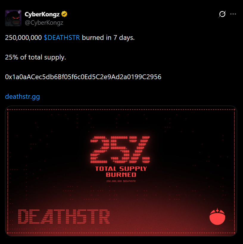 The strongest verified datapoint so far is that 250,000,000 DEATHSTR were burned in seven days, framed as 25% of total supply. A 26% figure is often cited, but 25% is the clearest official number. With a max supply of 1 billion, that implies roughly 750 million tokens remaining at that point in time.