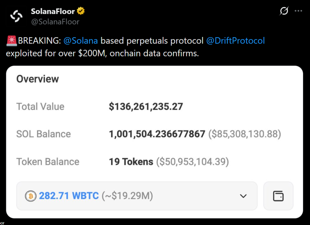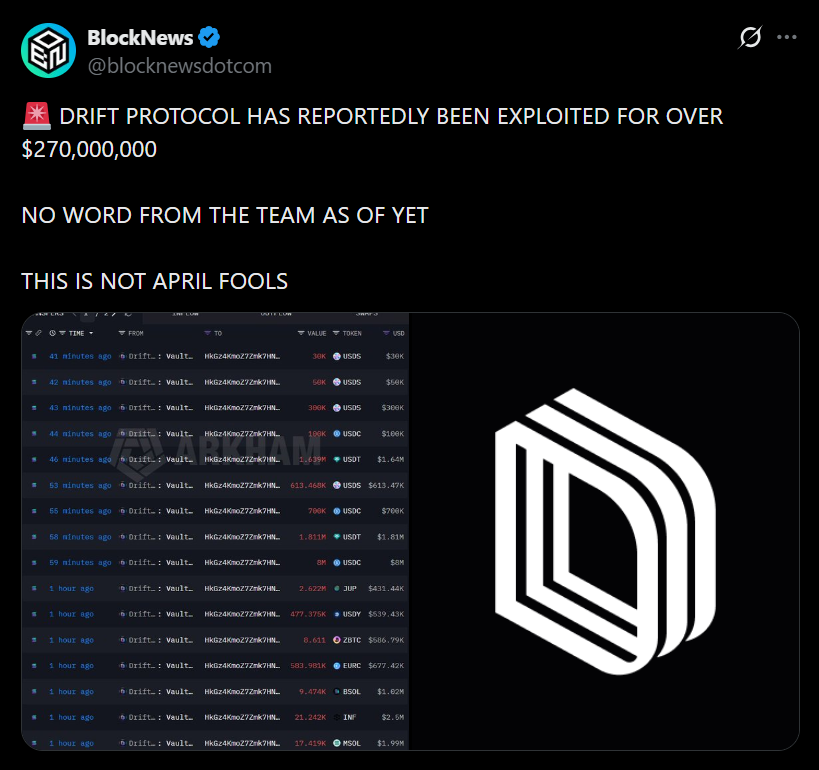 A major DeFi platform has been hit by what appears to be a massive crypto exploit, with early estimates pointing to losses exceeding $270 million. The incident, tied to Drift Protocol, unfolded quickly, with onchain data showing large volumes of assets being drained and funneled into a single wallet. At first, it looked like unusual activity, then… it became pretty clear something was wrong.