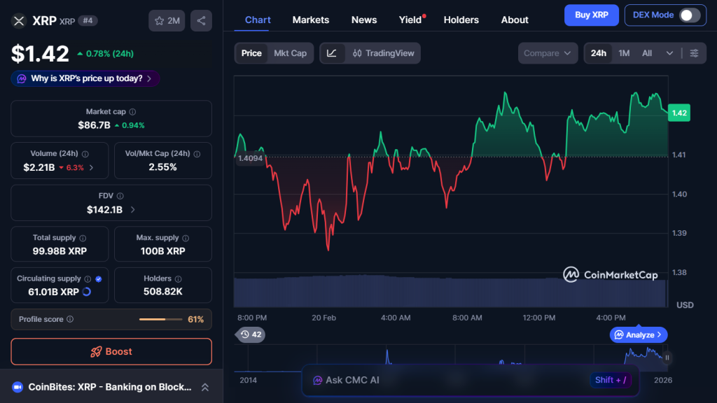 Despite the headline, XRP’s price barely reacted. The token remained stagnant around $1.40 and was down roughly 0.6% on the day. There was no breakout, no surge, and no real enthusiasm on the chart. If anything, XRP still looks fragile, with traders watching whether it could slip below $1 if market weakness continues.