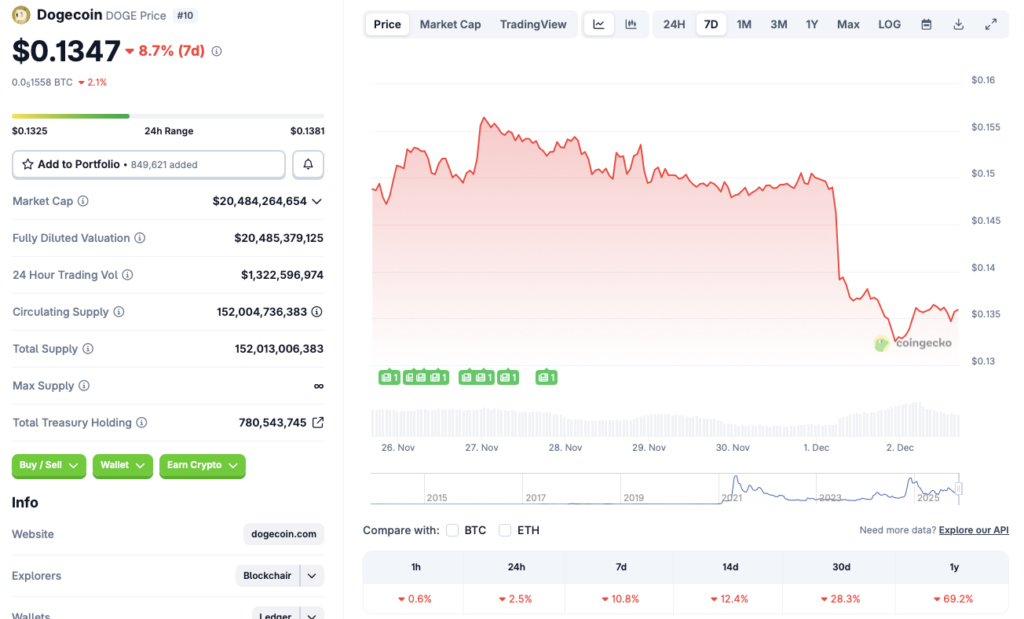 Dogecoin has been hit hard during the latest market-wide crash, sinking to multi-month lows as fear spreads across the crypto landscape. According to CoinGecko, DOGE has dropped 2.5% in the past 24 hours, 10.8% on the week, 12.4% over the last 14 days, and more than 28% across the past month. Since December 2024, the original memecoin has shed over 69% of its value. With sentiment at rock bottom, many holders are wondering whether DOGE is doomed — or simply waiting for the next macro-driven rebound.