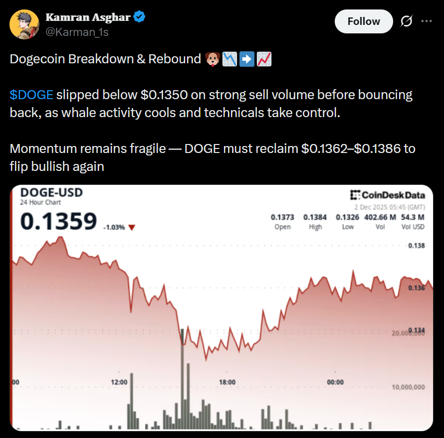 DOGE has also entered the ETF era, with recent launches from Bitwise and Grayscale. Although early trading volume was underwhelming, ETF inflows often increase once broader market sentiment improves. If Bitcoin stabilizes and risk appetite returns, DOGE ETFs could become a meaningful source of fresh capital.