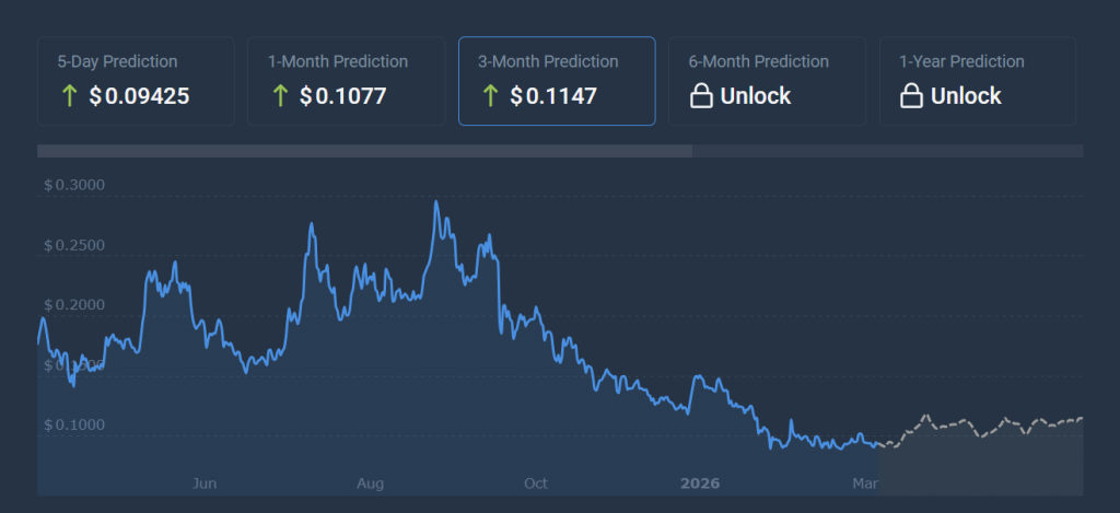 Some forecasts remain cautious. CoinCodex, for example, expects Dogecoin to peak around $0.1174 in mid-April before potentially pulling back again. Their outlook suggests a range between $0.09 and $0.11 in the near term, which points to consolidation rather than breakout.