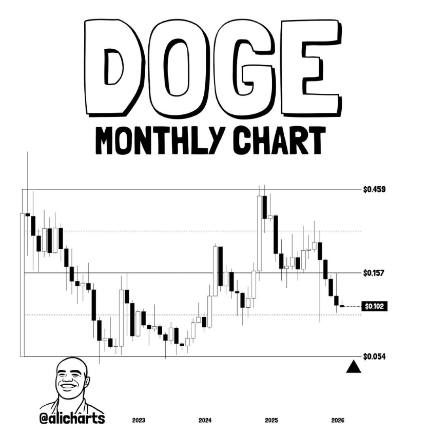 If DOGE can stabilize here, the next logical move would be a recovery push back into the previous consolidation range. That’s the “cleaner” scenario, and it’s what bulls will be hoping for. But if this level fails, attention shifts quickly toward the deeper monthly support Ali highlighted around $0.054, which stands out as the next major zone where a larger bounce attempt could form.