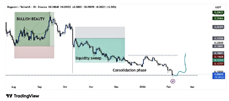 The chart labels this as a liquidity sweep, followed by DOGE settling into a long-term demand region. This is usually the area where markets either start building a base, or break down further if buyers don’t show up fast enough.