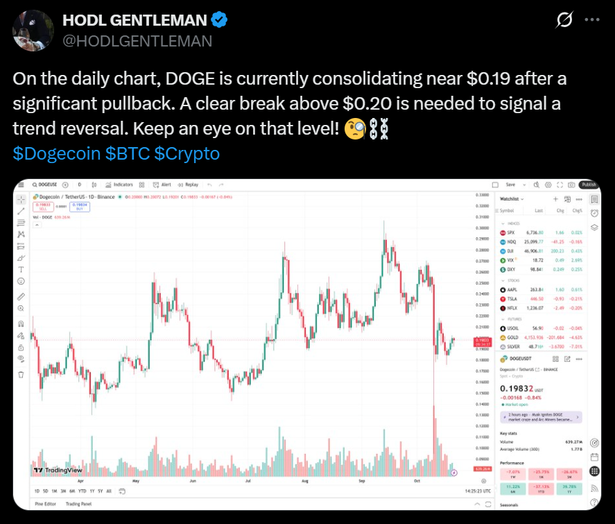 For now, traders are watching how DOGE behaves at $0.20. Failing to reclaim it could see the token continue consolidating between $0.18–$0.19, while a breakout could unleash a fresh leg higher and reaffirm bullish sentiment heading into November.