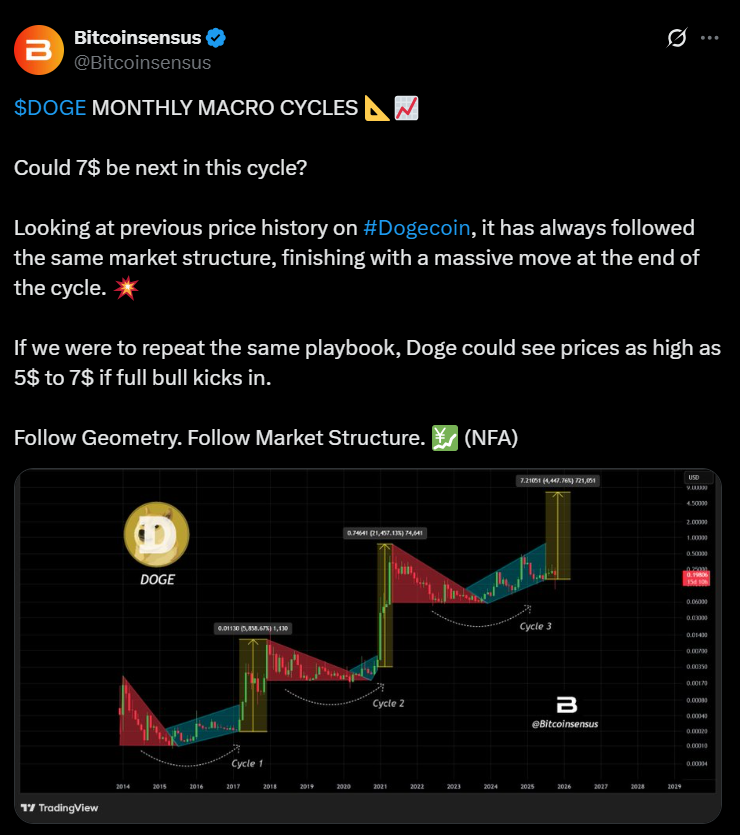 Supporting this, Trader Tardigrade observed that Dogecoin recently broke out of a falling wedge, suggesting short-term momentum toward $0.216. Meanwhile, a more bullish projection by Bitcoinsensus argues that if DOGE mirrors its past cycle structures, the asset could eventually push toward $5–$7, though such a move would take time and market alignment.