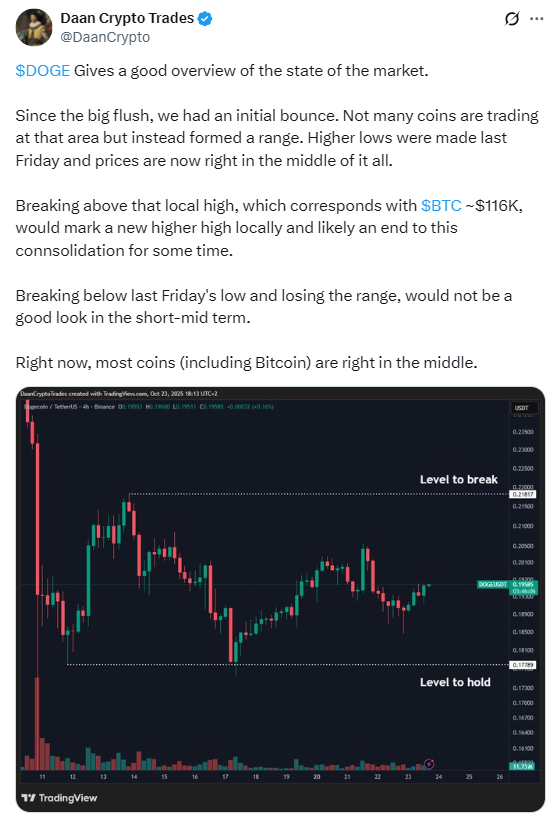 Analyst Trader Tardigrade pointed out that DOGE’s monthly chart looks almost identical to its first big cycle. Back then, Dogecoin moved sideways for months before exploding in price — and he believes we’re seeing that same accumulation phase again. Two false breakouts have already occurred inside its trading channel, which Tardigrade says could be the final shakeout before a “massive surge.” It’s the classic Dogecoin story — long quiet stretches, followed by chaotic, unstoppable rallies.