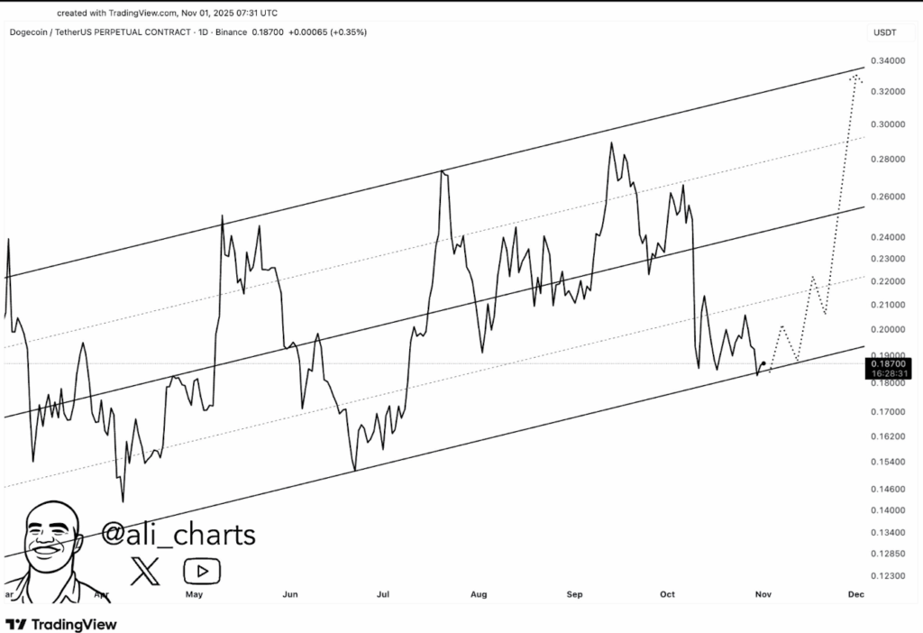 Crypto analyst Ali recently posted that $0.18 remains the key “buy the dip” level for Dogecoin. According to his chart, holding that zone could spark a rally toward $0.26 or even $0.33 if market conditions turn supportive. It’s not just about hype either—this level matches historical accumulation areas where past rallies began.