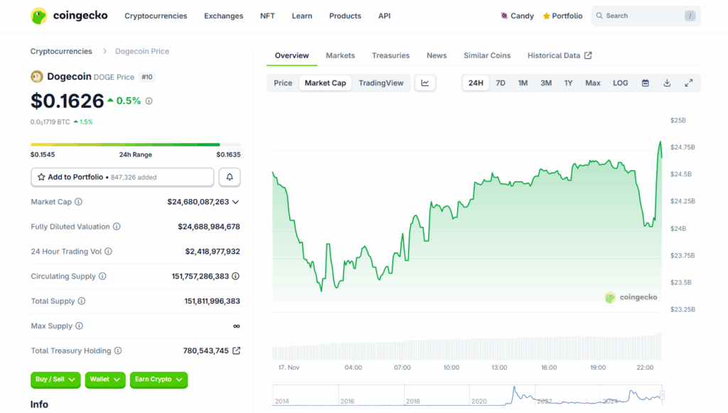 Dogecoin’s price looks like it’s trying to catch its breath around the $0.16 level. The original memecoin has found some short-term support here, but it’s still painted red almost everywhere you look. Over the last 24 hours, DOGE is down about 1.5%, 11.3% over the past week, 8.1% over the last 14 days, and 13.9% across the past month. Since November 2024, it has slid roughly 54%, reminding traders just how brutal this current cycle has been on even the most established altcoins.