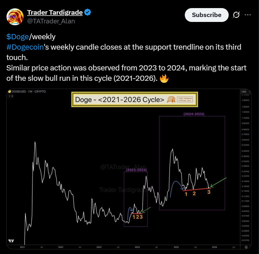 • Analysts see a chance for DOGE to hold this range and potentially rally toward $0.20 if market conditions improve.