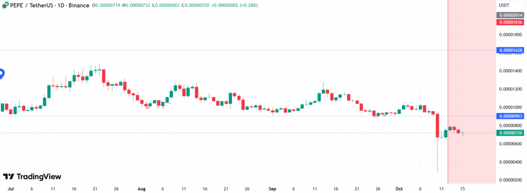 PEPE’s been unusually quiet lately — despite a 27.5% weekly drop, it’s holding around $0.0720. The token’s trading pattern is forming a downward triangle, with support near $0.0565 and resistance around $0.0573. This usually signals pressure building up before a move. If buyers defend support and market sentiment improves, analysts see potential for a jump to $0.0600 or even $0.0650 later this month.