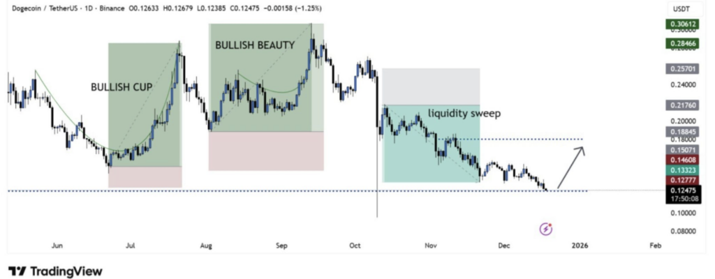 - DOGE has pulled back into a historically important support zone near $0.12–$0.13