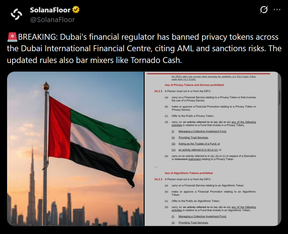 • Dubai banned privacy coins like Monero and Zcash inside its main financial zone.