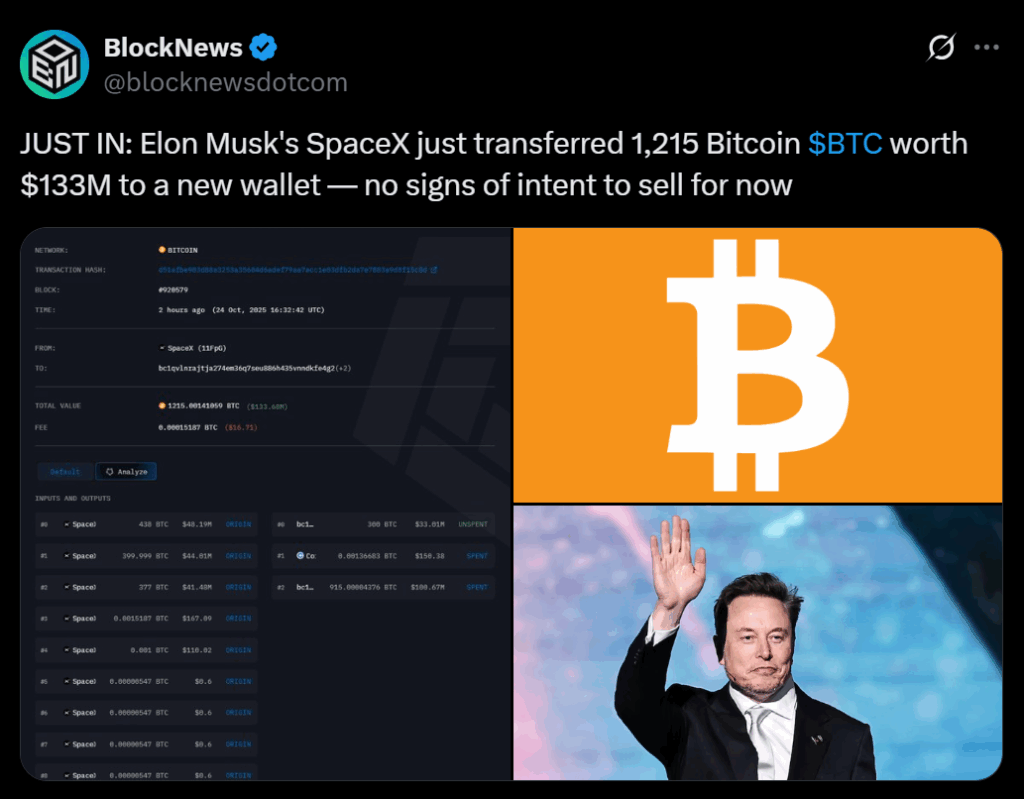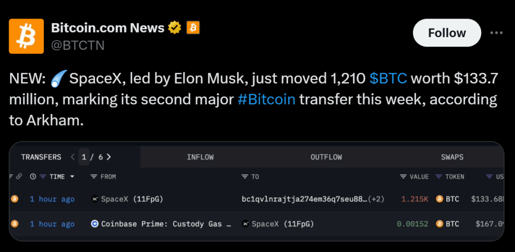 Elon Musk’s SpaceX just made another huge move in crypto—transferring roughly $133.7 million worth of Bitcoin to new wallets on Friday. This marks the second major transaction in less than a week, according to data from Arkham Intelligence. Earlier in the week, SpaceX reportedly shifted around $268.5 million worth of Bitcoin, its first major activity since July. Together, those moves suggest something’s definitely happening behind the scenes.