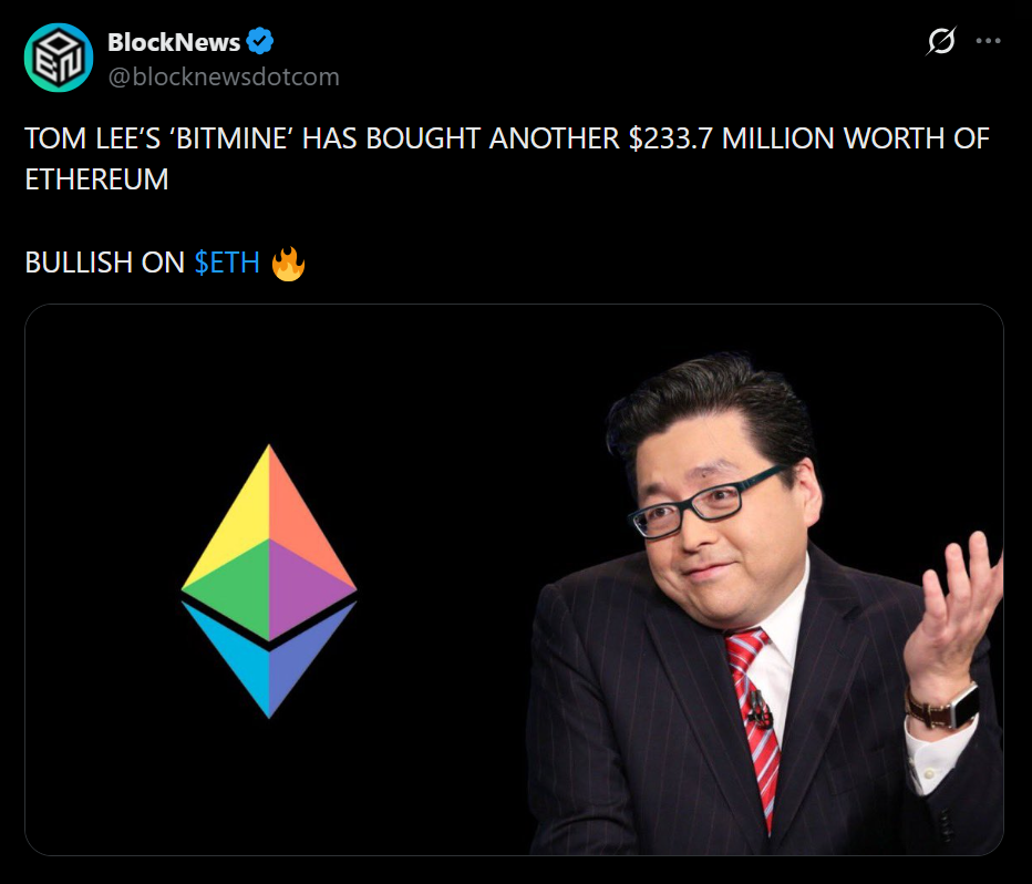 Just days earlier, the firm disclosed it had purchased 101,627 ETH in a single week, worth roughly $239 million at current prices, which is not exactly a small move. That pushed its total holdings to around 4.976 million ETH, or about 4.12% of the circulating supply, already a massive position by any standard.