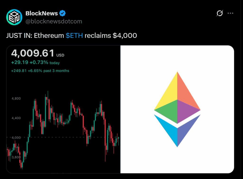 - Ethereum holds above $4,000 with potential upside to $6,000.