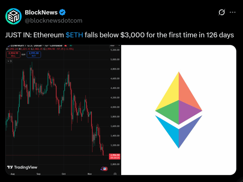 Ethereum’s price has broken deeper into a bearish structure that’s strengthened throughout the past week. With momentum weakening, ETF outflows accelerating, and long-term holders dumping at the fastest pace seen since 2021, ETH is now sliding toward a critical level: the $3,000 support zone. The pace of the decline has raised the question many traders are asking — is Ethereum preparing for an even deeper correction?