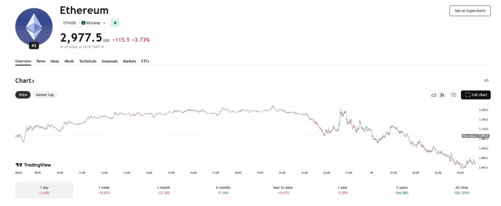ETH is currently trading near $3,182 after hitting an intraday low of $3,023 — leaving almost no room between current prices and the critical $3,000 support zone. If sellers continue to dominate and ETH fails to break above the $3,150–$3,200 range, a direct slide into $3,000 becomes increasingly likely this week.