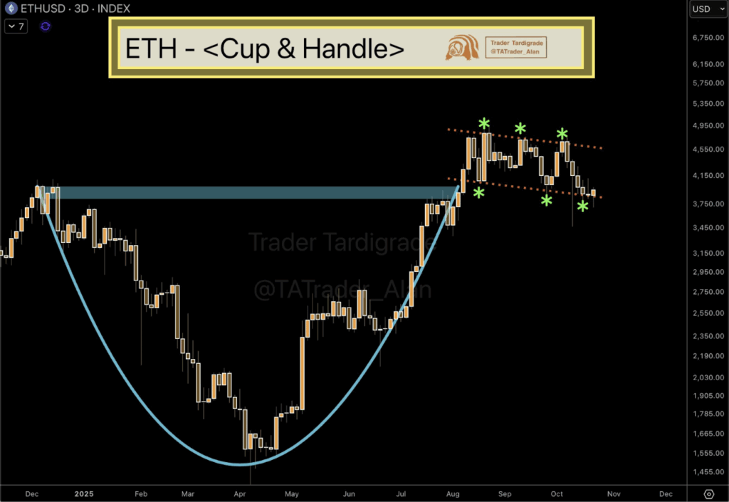 On the 3-day chart, Ethereum’s price action seems to be shaping into a classic cup-and-handle pattern — a formation that often hints at a bigger breakout down the road. The “cup” developed slowly between January and August, marking a long recovery phase after last year’s correction. Now, the “handle” appears as a downward-sloping channel, tightening momentum before a potential move.