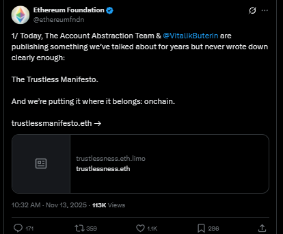 The Ethereum Foundation, alongside Vitalik Buterin, just rolled out something that feels like a return-to-roots moment for the entire ecosystem: the Trustless Manifesto. It’s basically a reminder — or maybe a warning — that Ethereum’s core values shouldn’t get lost in the rush for convenience. The message is loud but not exactly new: decentralization, censorship resistance, neutrality, and self-custody aren’t optional add-ons… they are Ethereum. And the foundation seems determined to put those principles back front and center.