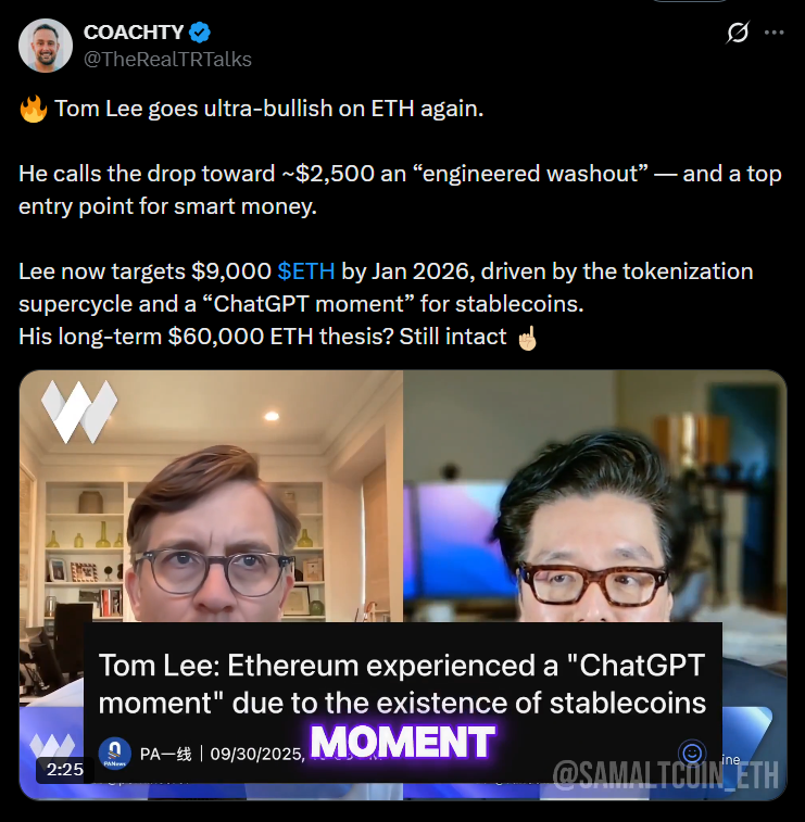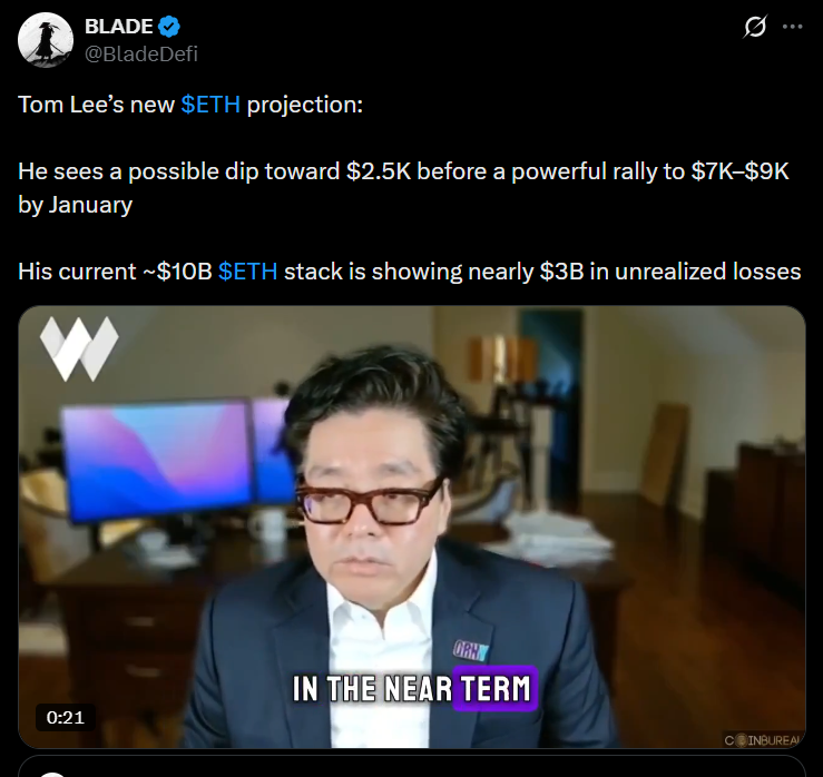 • Lee still expects a sharp ETH rebound, targeting $7,000–$9,000 early next year.