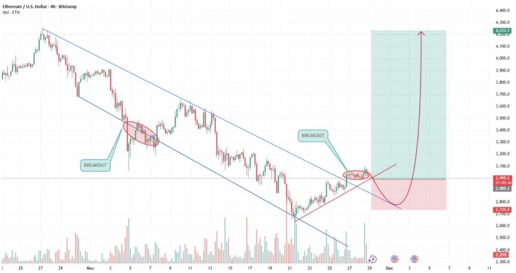 The chart he shared shows Ethereum breaking out of a long, stubborn descending channel that had trapped price action for weeks. ETH hit the bottom of that channel, bounced hard, and started carving higher lows along a rising trendline—a classic sign that buyers are waking back up. Price has now moved above the old resistance near $3,000, and that level has flipped into support, which is usually a good sign that the market’s settling into its new range instead of panicking.