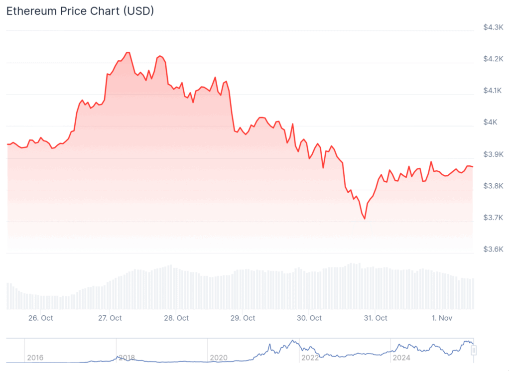 Ethereum’s price has been holding steady around $3,822.60 after facing rejection near the $3,880 resistance band. The asset gained 1.5% on Thursday as volume spiked 19% above the weekly average, showing that traders remain active even as price momentum cools off. After testing a high of $3,887, ETH slipped back to $3,820 in the final hour, keeping the range tight between $3,730 and $3,880. Support currently sits at $3,680–$3,720, with $3,880 now acting as a crucial psychological ceiling.