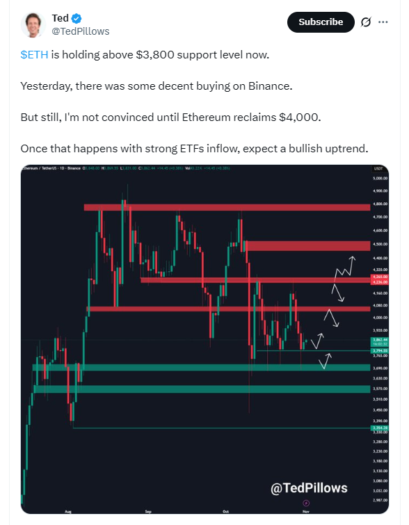From a chart perspective, ETH is walking a fine line. The price recently dipped below the 50-day and 100-day moving averages, hinting at fading short-term momentum. If bulls fail to defend $3,800, the next key demand zone sits around $3,500, with the 200-day MA lurking near $3,200. On the flip side, a reclaim of $4,000 could flip sentiment quickly.