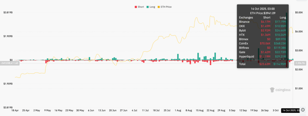 - ETH drops 8% to $3,940, triggering $115M in long liquidations.