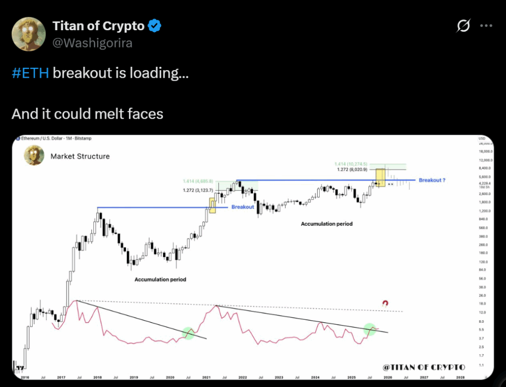 Market strategists like Michael van de Poppe and Titan of Crypto say ETH’s drop is a classic pullback inside a broader uptrend. Van de Poppe highlighted ETH/BTC’s bounce from 0.032 as a “perfect buy zone,” while Titan of Crypto noted that ETH’s RSI has broken out of a multi-year downtrend, a technical sign of long-term strength.