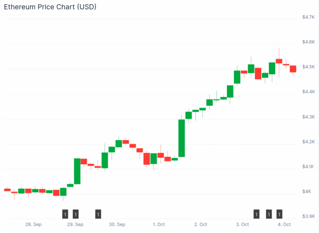 Market analyst Ted Pillows thinks $4,500 is the next big wall for ETH. He notes that a clean break above that resistance could open the door to $4,700—or even $4,750—before the next pause. On the flip side, failure to hold momentum could drag ETH back toward $4,250 in a short-term pullback.