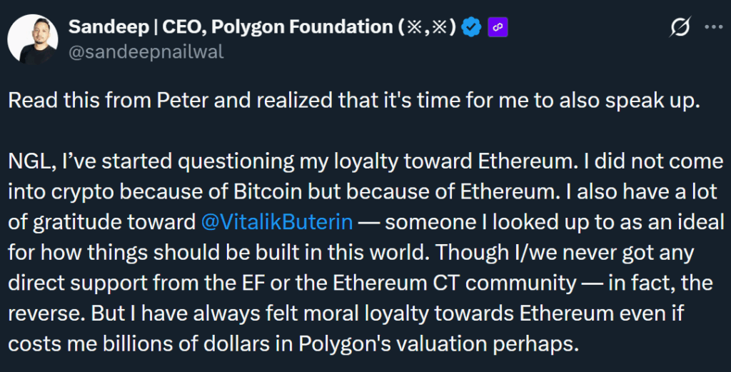 In a recent post, Nailwal publicly shared frustration with the Ethereum community, describing it as dysfunctional and dismissive of contributors like Polygon. He praised Vitalik Buterin but slammed the Ethereum Foundation and community for years of neglect, trolling, and exclusion.