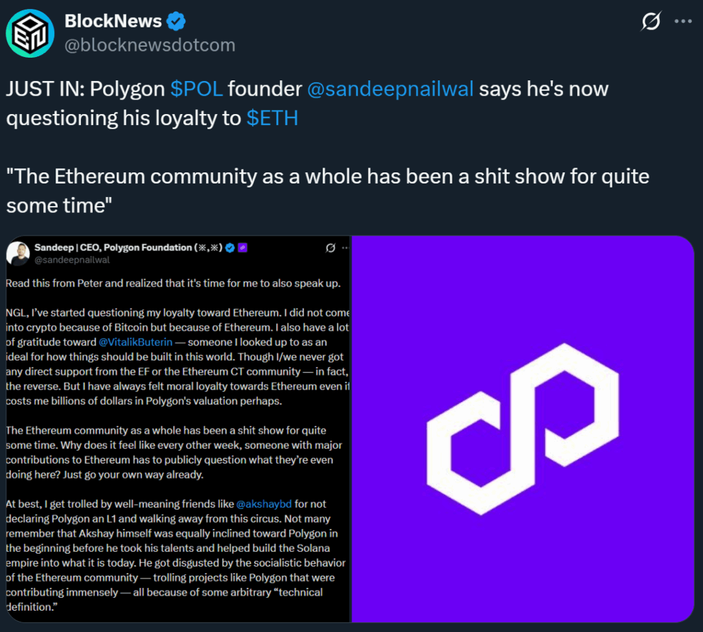 - Sandeep Nailwal, co-founder of Polygon, criticized the Ethereum community, calling it dysfunctional and dismissive.