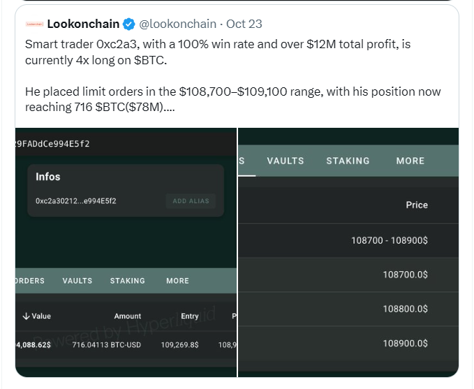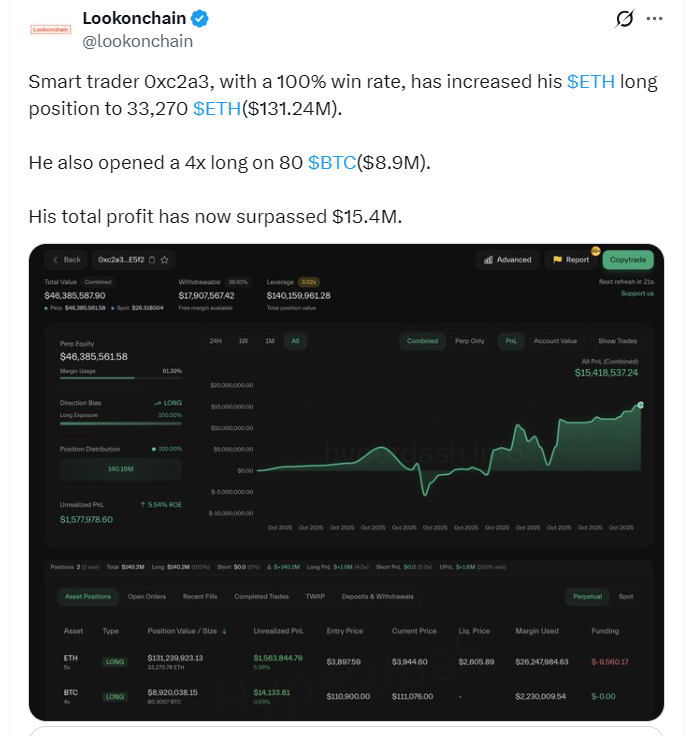 - A whale with a flawless 100% win rate opened a $131M long position on Ethereum, signaling strong bullish conviction.