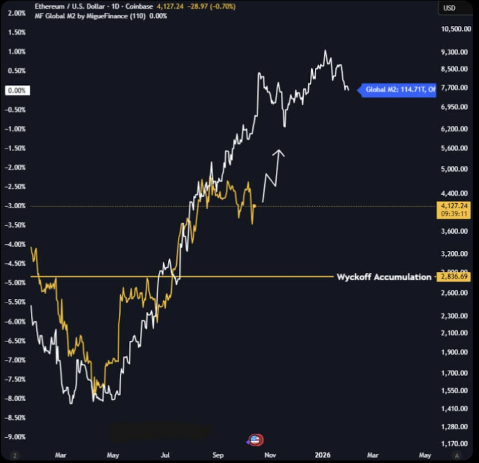 Market watcher Hailey LUNC believes Ethereum could be gearing up for a massive breakout cycle — with fair value targets ranging from $8,000 to $10,000 by Q1 2026. Her reasoning? Liquidity. Specifically, Ethereum’s price trend has often followed the M2 global money supply, which is expected to expand again later this year.