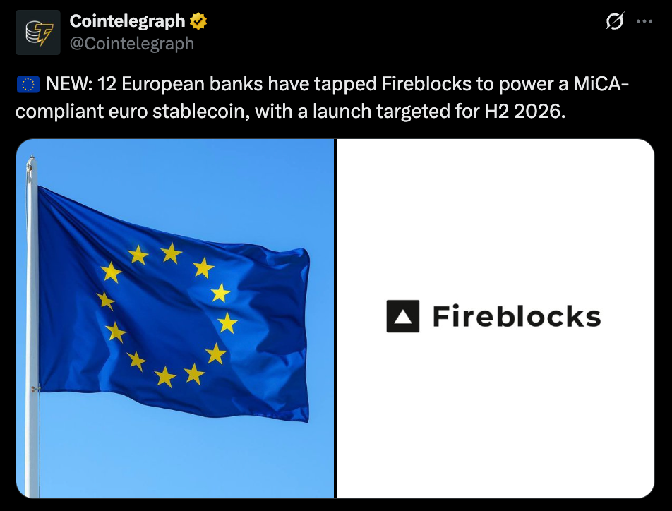 - 12 major European banks partner with Fireblocks for euro stablecoin