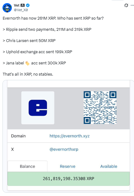 The XRP accumulation wasn’t random — it came as part of Evernorth’s deal with Ripple and other partners like SBI Holdings, Pantera Capital, and Kraken. Ripple’s co-founder Chris Larsen followed through on his earlier pledge, contributing 50 million XRP (around $124 million). Ripple Labs also transferred two separate batches of 211 million and 319,000 XRP to fulfill its commitment. Validator Vet confirmed these transactions on X, noting that Uphold exchange also participated. With these moves, the Evernorth fund now officially holds 261 million XRP, marking a massive milestone in institutional backing for the token.