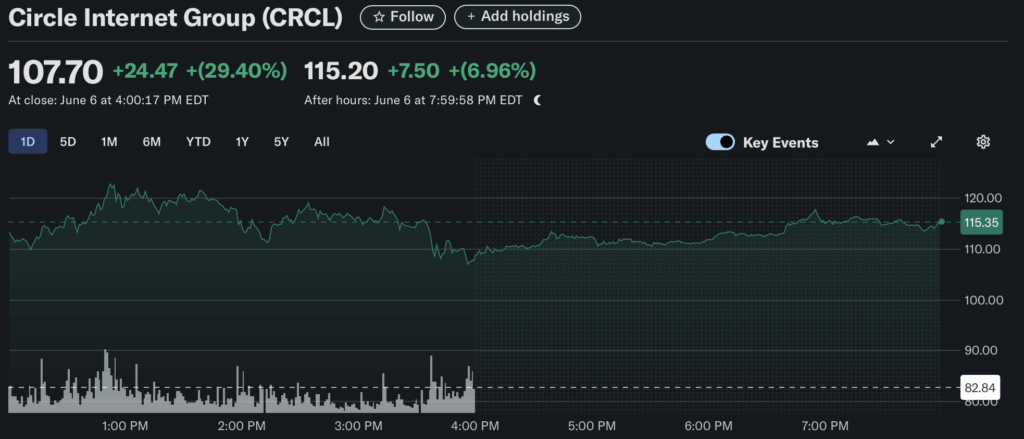 Circle didn’t just slide onto the public markets… it launched like a damn rocket. The IPO was priced at $31 a share, but by the end of day one, it was trading above $83. That’s a 168% rip, and it put Circle’s valuation above $18 billion almost instantly. That kind of performance sends a very clear message: stablecoins are no longer just a crypto niche—they’re becoming Wall Street darlings.