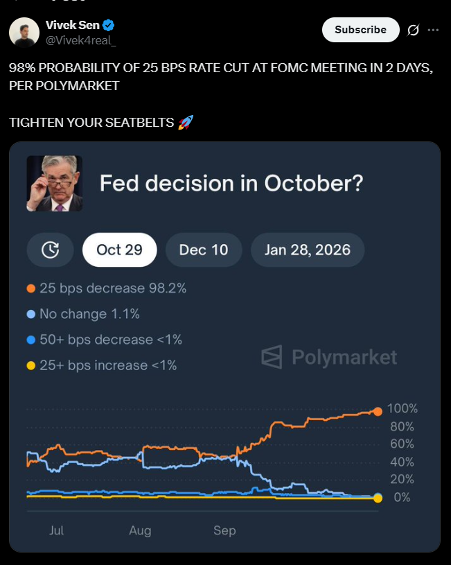 • The Fed is expected to cut rates by 0.25% this week, lowering the policy range to 3.75%–4.00%.