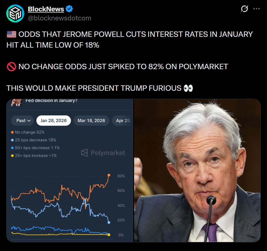 Expectations for another Federal Reserve rate cut in January have dropped sharply, with Polymarket data showing odds falling to just 18 percent—an all-time low for the contract. This shift comes only days after the Fed delivered its December cut, marking a clear cooling in market conviction that Chair Jerome Powell will continue easing at the start of 2026. The sudden repricing signals a market adjusting to a more cautious central bank narrative, especially after Powell emphasized the need to wait for more economic data before committing to further cuts.