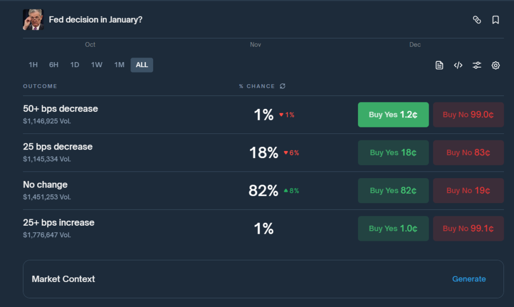 - Polymarket odds for a January rate cut have collapsed to 18 percent, the lowest on record.