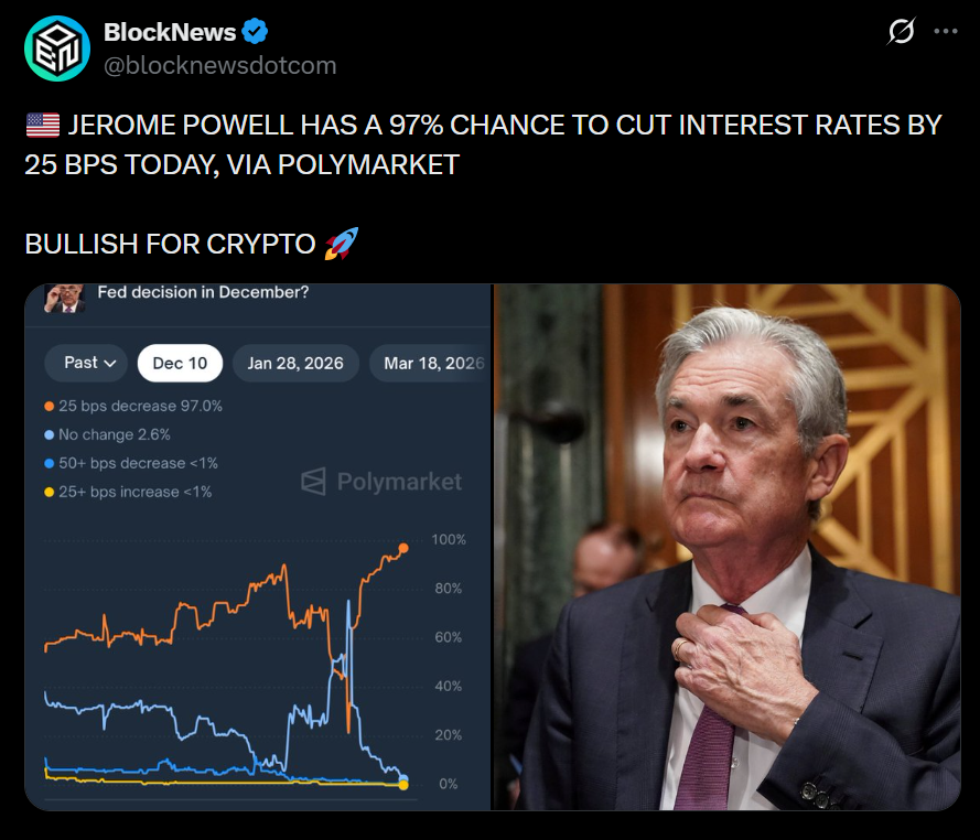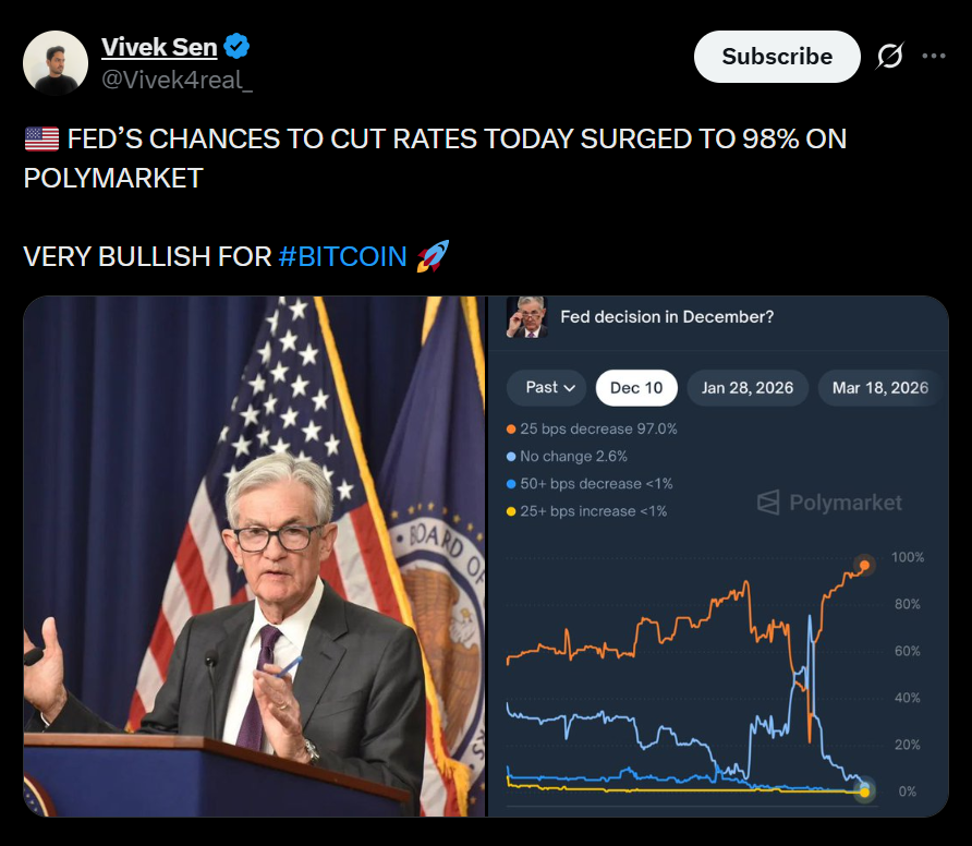 - Polymarket shows 98% odds the Fed will cut rates by 25 bps on Wednesday.
