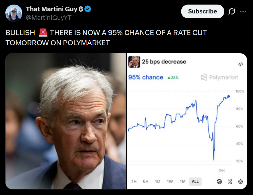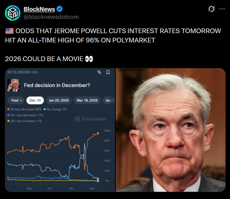 The Federal Reserve kicked off its final meeting of the year on Tuesday, Dec. 9, and traders are almost certain about what comes next. Polymarket data now shows 96% odds that the Fed will deliver a 25-basis-point rate cut on Wednesday — the third cut of 2025. The central bank is widely expected to push forward with easing as recession worries, softening labor signals, and political pressure mount. Bitcoin and risk assets have already begun to drift higher, but the true reaction will likely come after Powell’s press conference, where tone matters almost more than the cut itself.